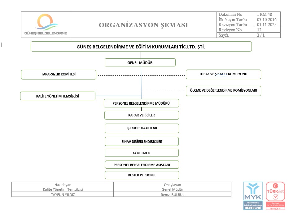 Güneş Belgelendirme Mesleki Yeterlilik Kurumu (MYK) tarafından yetki kapsamındaki ulusal yeterliliklere göre sınav ve belgelendirme faaliyetlerini